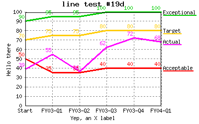 Specify different line colors to above where line "Acceptable" has a color of transparent so the background color will be seen as the line color. %CHART{name='lineTest15b' table='table1' type='line' data='R2:C4..R7:C7' xaxis='R2:C2..R7:C2' title='line test #15b' yaxis='on' ymin='0' ymax='100' ylabel='Hello there' xlabel='Yep, an X label' datalabel='box' legend='R1:C4..R1:C7' colors='transparent,#AAffAA,#AAAAff,#AAAAAA'}% |