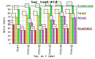 Specify different line colors to above where line "Acceptable" has a color of transparent so the background color will be seen as the line color. %CHART{name='lineTest15b' table='table1' type='line' data='R2:C4..R7:C7' xaxis='R2:C2..R7:C2' title='line test #15b' yaxis='on' ymin='0' ymax='100' ylabel='Hello there' xlabel='Yep, an X label' datalabel='box' legend='R1:C4..R1:C7' colors='transparent,#AAffAA,#AAAAff,#AAAAAA'}% |