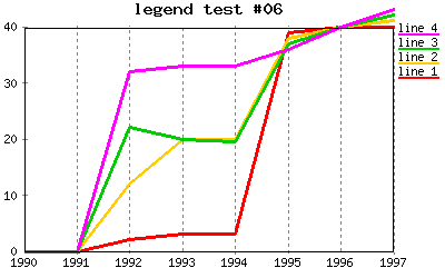 data and legend Sample 4 line chart. %CHART{name="constDataTest01" type='line' table='table1' data='R2:C4..R99:C7' xaxis='R2:C2..R7:C2' title='Constant data test #01' yaxis='on' legend='R1:C4..R1:C7' ymin='0'}% |
