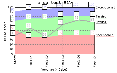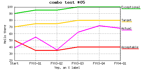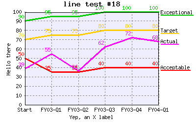 Specify different line colors to above where line "Acceptable" has a color of transparent so the background color will be seen as the line color. %CHART{name='lineTest15b' table='table1' type='line' data='R2:C4..R7:C7' xaxis='R2:C2..R7:C2' title='line test #15b' yaxis='on' ymin='0' ymax='100' ylabel='Hello there' xlabel='Yep, an X label' datalabel='box' legend='R1:C4..R1:C7' colors='transparent,#AAffAA,#AAAAff,#AAAAAA'}% |