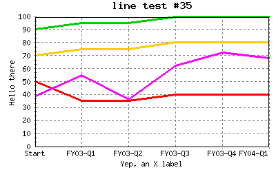 Restore bgcolor and add ygrid = on (changing from dotted ygrid to solid ygrid) to above. %CHART{name='lineTest20' table='table1' type='line' data='R2:C4..R7:C7' xaxis='R2:C2..R7:C2' title='line test #20' yaxis='on' ymin='0' ymax='100' ylabel='Hello there' xlabel='Yep, an X label' datalabel='off off on box' legend='R1:C4..R1:C7' ygrid='on'}% |